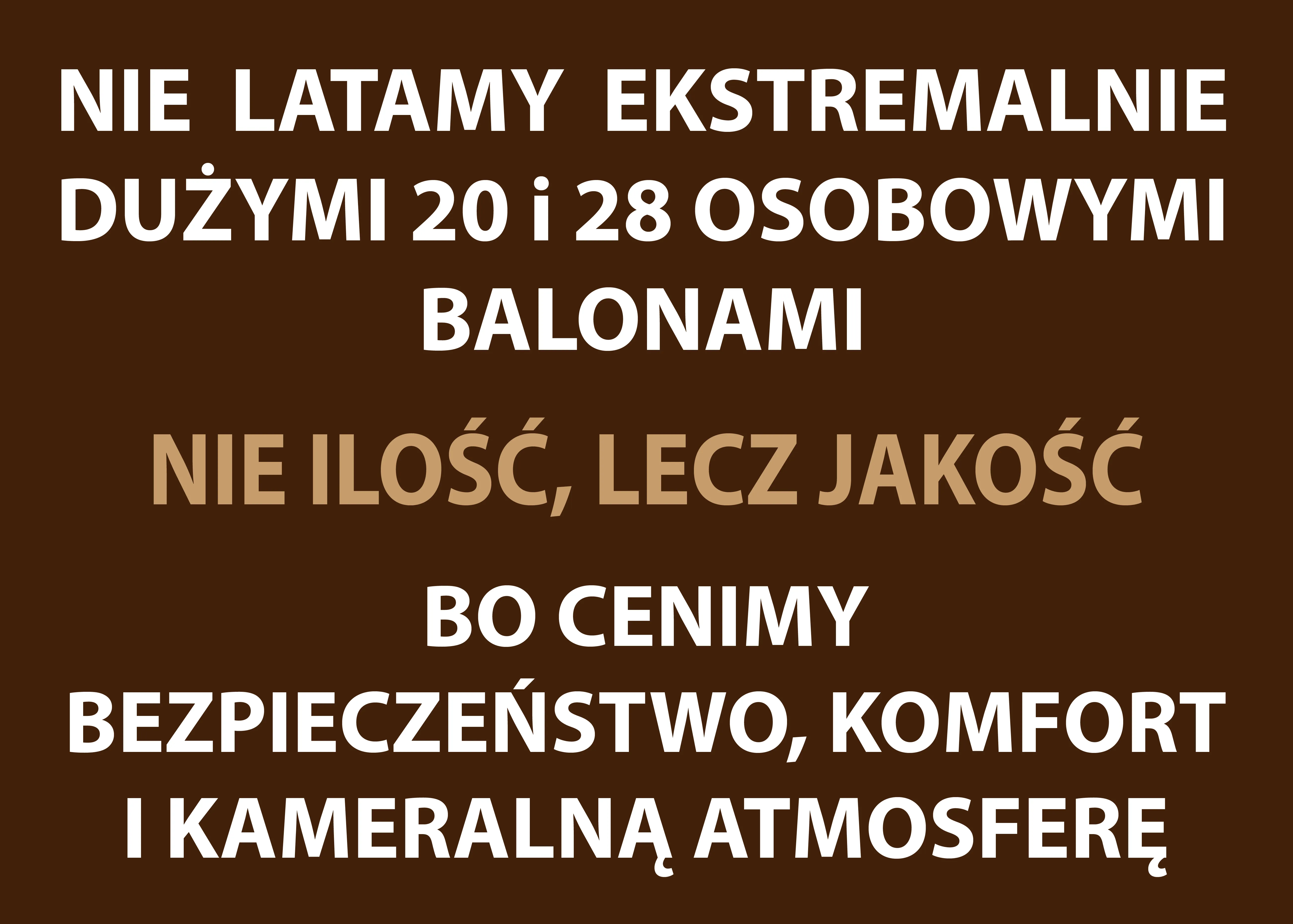 UWAGA: Loty balonem, mimo że są jedną z najbezpieczniejszych przygód lotniczych, wywołują niemal u każdego wzmożone emocje i podnoszą poziom adrenaliny. Z tego powodu nie zalecamy ich pasażerom odczuwającym paniczny lęk przed lataniem, kobietom w zaawansowanej (powyżej 3 miesiąca) lub zagrożonej ciąży oraz osobom którym lekarze zalecili unikanie nadmiernych emocji.
